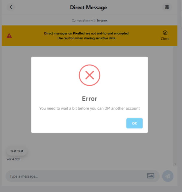 Liebe Nutzende. Könnt ihr mal testweise mir und anderen Menschen AUF diesem Server Direktnachrichten schicken? Da scheint ein Bug zu sein, dass die Nachrichten nicht durchkommen oder angezeigt werden. Aber ich brauch mehr Futter, um das zu verfolgen. Schreibt bitte gerne eure Erfolge oder Probleme damit hier runter als Kommentar.